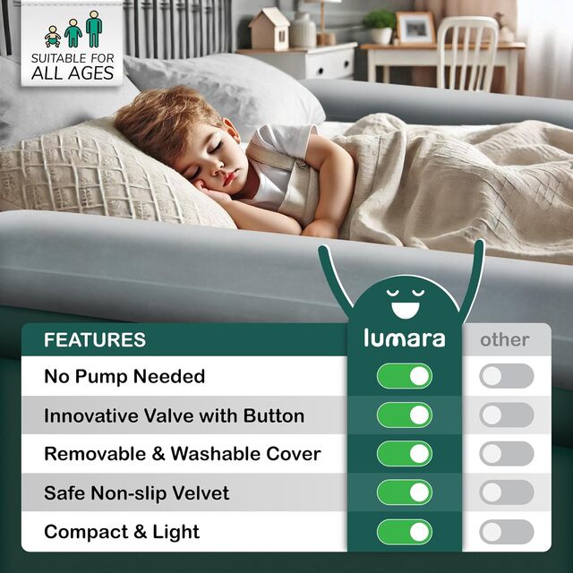 Give your child safe and secured sleep wherever you go with the LUMARA Inflatable Bed Rail. Designed to prevent accidental falls this travel-friendly bumper offers parents peace of mind at night whether in hotels, guest rooms, or at Grandma’s house.