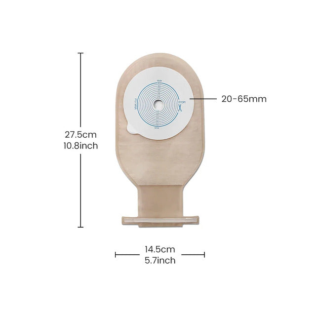 This pouch accommodates stoma sizes from 20 mm to 65 mm offering versatile fit and adaptability. Its generous capacity and durable one-piece design provide effective containment and convenience.