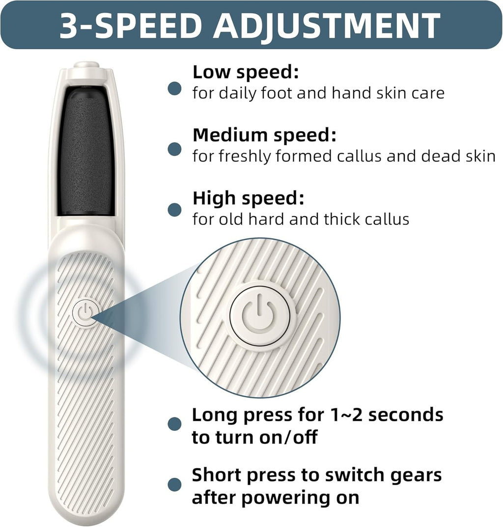 With its 3 adjustable speeds you stay in full control of your foot care. From gentle exfoliation to deep callus removal this tool adapts perfectly to the unique texture of your skin for a safe and personalized result.