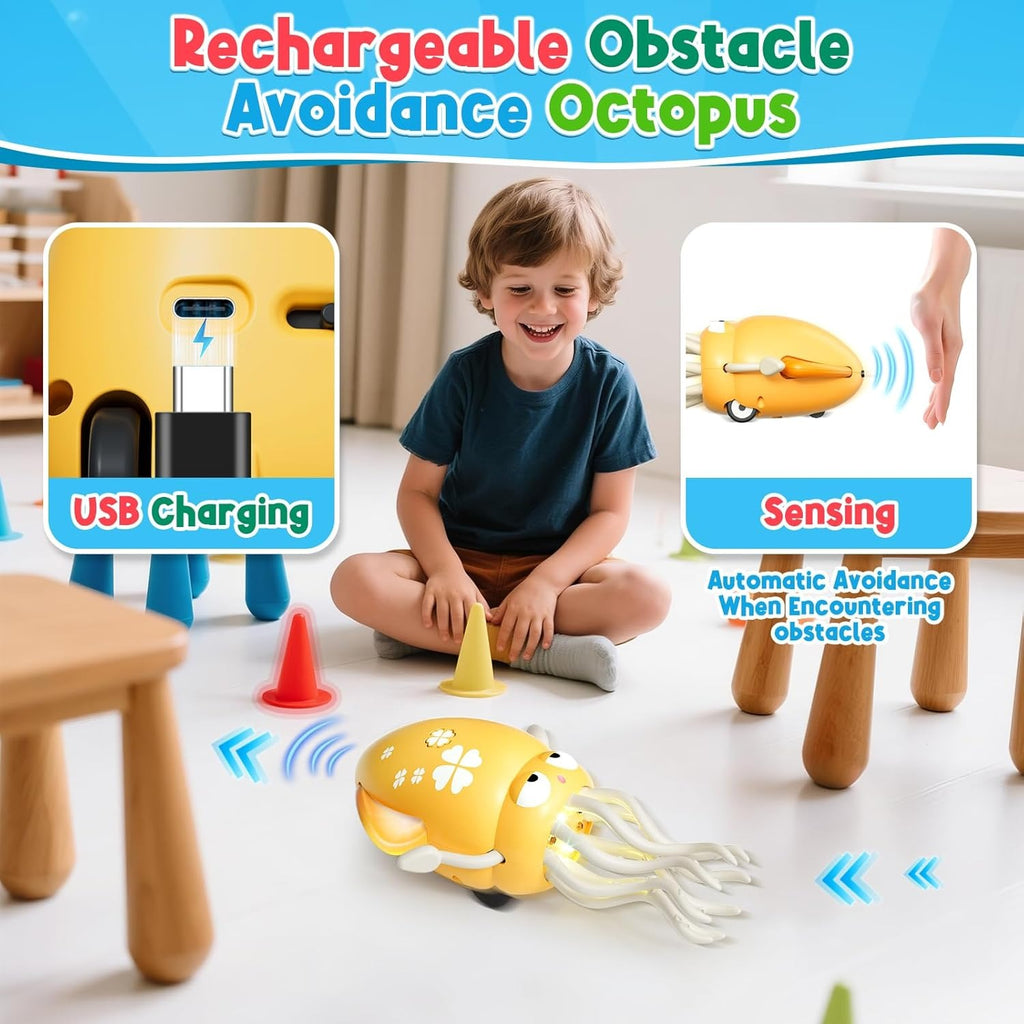 Built-in obstacle-avoidance technology keeps the octopus moving safely around furniture and walls. It never gets stuck so your child’s excitement never stops.