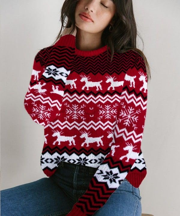 The classic crew neck and long sleeves give this jumper a timeless charm. Pair it effortlessly with jeans, leggings, or skirts for a look that’s both festive and fashion-forward.