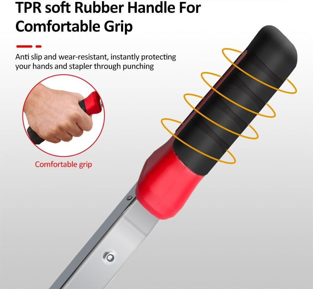 The ergonomic rubberized handle reduces shock and vibration, so you stay comfortable even after hours of stapling. Say goodbye to hand fatigue and hello to confident control, no matter the project size.