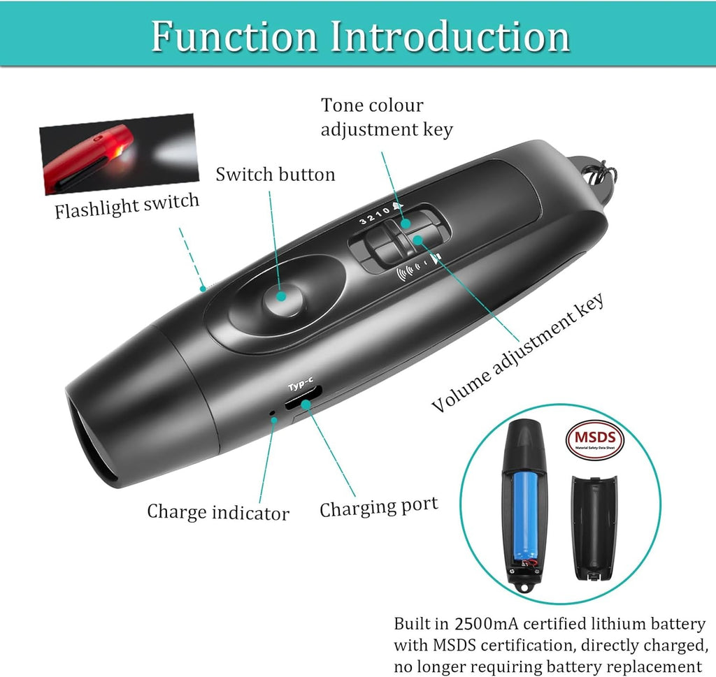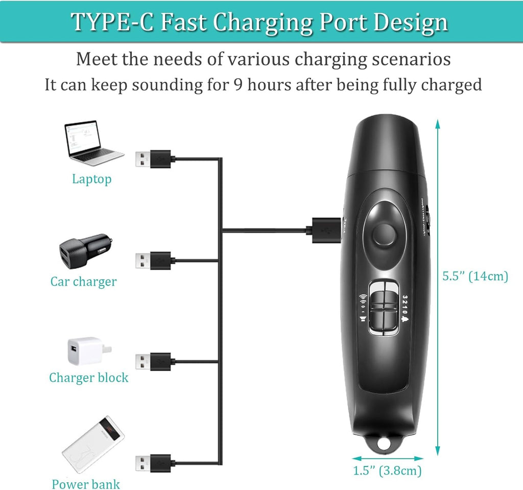 The built-in 2500mAh lithium battery keeps your whistle running for up to 9 hours of continuous sound on a full charge. Simply plug in the USB cable and you're ready to go again - no need for disposable batteries, ever. Save time, save money, and stay powered.